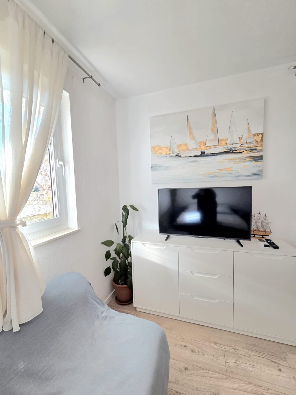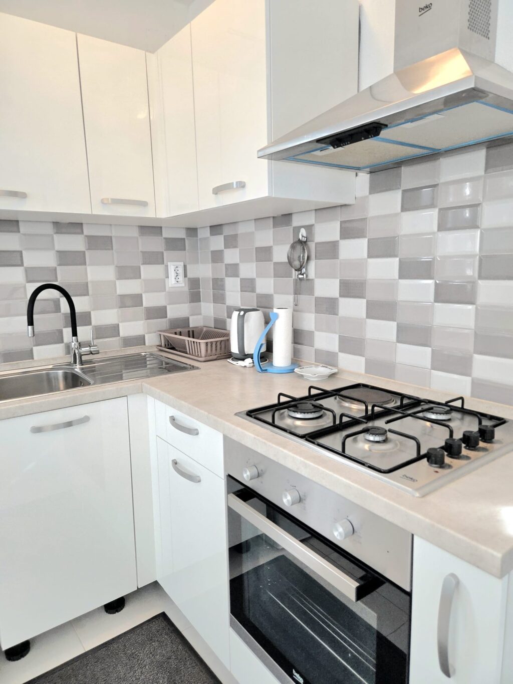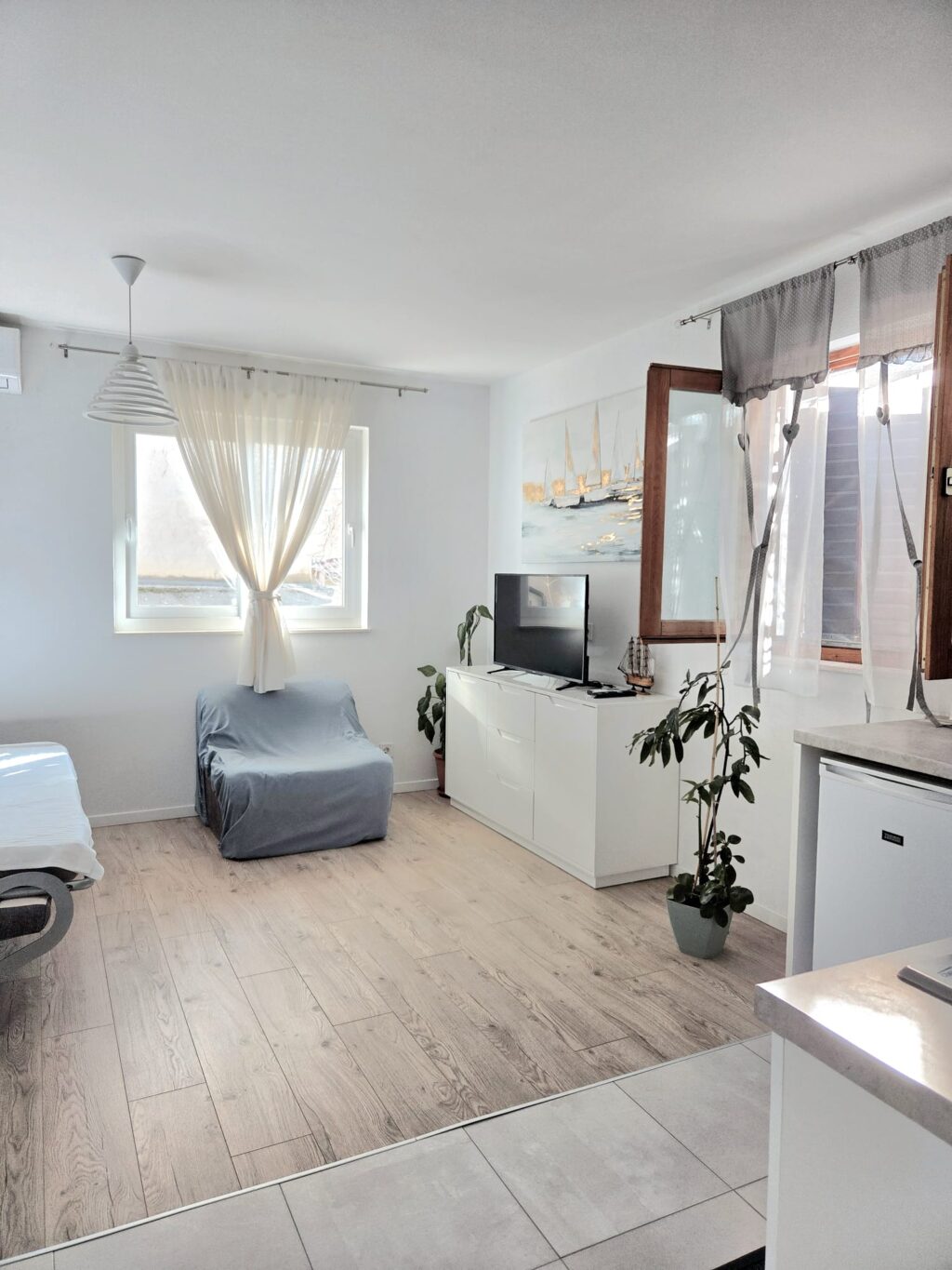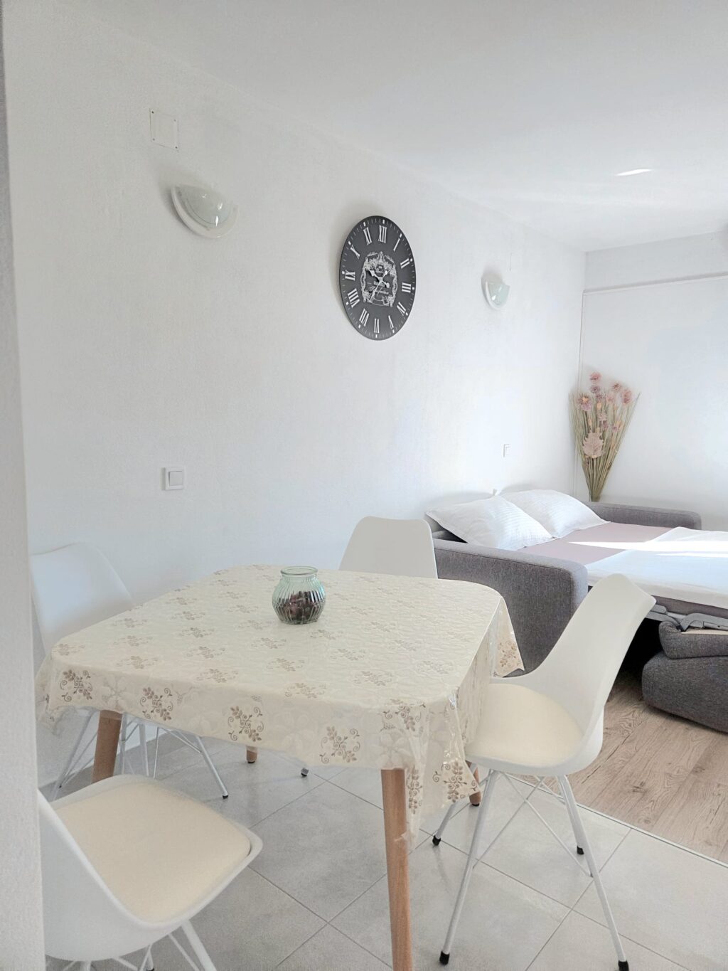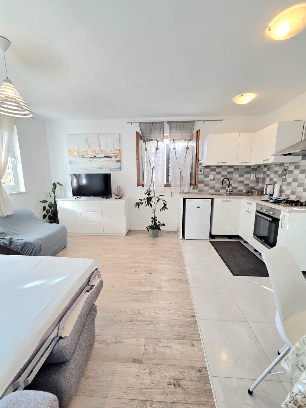 *Spacious accommodation:  1 big bedroom (it can be double bed, and it can be 2 separate beds), 1 bathroom, a living room with sofa bed, equipped and functional kitchen (kettle, oven, plates, pans, cutlery…), sitting area in front of entrance door